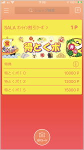 【スマホの準備を完了する】 0. PUNTOアプリのインストールと設定を済ませる アプリのインストールと設定が済んでいない場合は、先にコチラをご確認ください (初期設定時は、お店の登録がないので、何も表示されていないオレンジ色の画面が表示されます) 【QRコードをスマホに保存する】 1. SALAで開始用QRコードを発行し画像をLINEトークで送付 ※読込みは1回限りです (『得とくポ』購入者お一人ずつ個別に発行されます) 2. お送られて来たQRコードをタップ 3. 画面右下の下線付き矢印「↓」をタップして画像を保存 4. 画像が保存されたら左上の「✕」印をタップして閉じる 【保存したQRコード画像を読み込む】 5. 左上の「<」印、左下の「ホーム」アイコンの順にタップしてホーム画面へ 6. ホーム画面右上の「友だち追加」アイコンをタップ 7. 上部中央の「QRコード」をタップ 8. 読み取り画面右上の「QRコード」アイコンをタップ 9. 保存したQRコード画像をタップして選択 10. 画面上部に表示された「リンクを開く」をタップ 11. PUNTOアプリのダウンロードページが表示されたら「開く」をタップ 12. QRコード読み込みが完了 SALAのクーポン画像とポイント獲得のメッセージが表示される 13. OKをタップしてトップ画面に戻る TOPページにSALAのポイントカード一覧が表示されます これで開始用QRコード画像の読込みは完了です