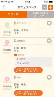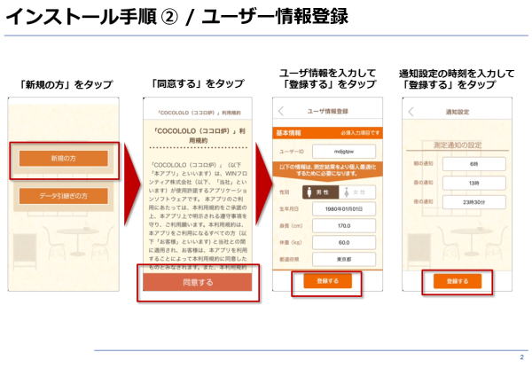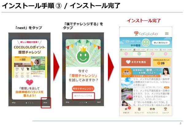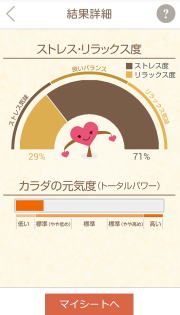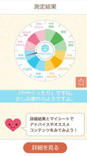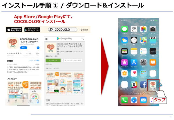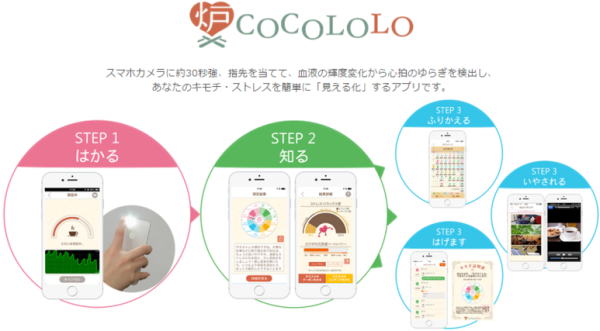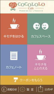 ダウンロードとインストールが済んだら、COCOLOLOのアイコンをタップして、ユーザー情報の登録に進んでください。 ![]() ※ 入会金無料特典をご希望の方は、必ず「ユーザーID」を mezame@ieta.jp 宛にお知らせください 【ユーザー情報】 ◇ 性別 ◇ 生年月日 ◇ 身長(cm) ◇ 体重(kg) ◇ 都道府県 以上を入力したら「登録する」をタップします。 【通知設定】 次に、通知設定の画面で、時刻を入力して「登録する」をタップします。 ![]() ■ 「COCOLOLO」のダウンロート&インストール方法(PDF) クリックして上記の内容をPDFファイルで表示 ↓ ![]() ■ 「COCOLOLO」の使い方 インストールが済んだら早速メイン機能を使ってみましょう。 COCOLOLO(ココロ炉)の『キモチをはかる』を使って スマホカメラで自律神経を測定します。 ![]() まず、『キモチをはかる』をタップすると、直前までしていた活動について質問されます。 該当するものをタップして選択してください。 ![]() スマホのフラッシュが光りますので、フラッシュを触らないように注意しながら カメラに指先を当てて測定開始! ![]() 測定終了画面になったら、『測定結果を見る』をタップします。 ![]() 測定結果はルーレットで表示されます。 ![]() 詳細な結果を見るには、『詳細を見る』をタップします。 ストレス度(交感神経)、リラックス度(副交感神経)のバランスが表示されます。 ビジュアルに表示されるので、直感的に自律神経バランスがわかります。 ![]() ■ 「COCOLOLO」のその他の機能 《カフェノート》 月単位もしくは日単位で結果をまとめて見られる機能です。 自律神経測定を毎日3回程度行って、日々の生活と自律神経系の関係、特に影響が大きいライフスタイル・生活習慣を知ることができます。設定のページで、1日3回まで通知時間を設定できます その日あったこと、気づいたことはメモ欄に記録していきましょう。 ![]() 《キモチをととのえる》 キモチをととのえるではおススメの1冊、おススメの1曲、 COCOLOLOパートナーのクーポンなどがあります。 ![]() 《カフェスペース》 カフェスペースでは、COCOLOLOユーザー同士でキモチのシェアが可能です。 ![]() 《COCOLOLOからのアドバイス》 測定結果に応じてCOCOLOLOがいろいろなアドバイスをしてくれます。 いろいろ試してみて、楽しみながら自律神経バランス改善しましょう。 ![]() |