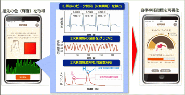 ![]() COCOLOLOは、スマホカメラにたった30秒指先を当てるだけ! 皮ふの色変化から心拍のゆらぎを検出し、あなたのキモチ・ストレスを簡単に「見える化」します。測定結果は、8タイプのキモチ(ストレス・リラックスの傾向、お疲れ具合)をルーレットで分かりやすく表示します。 また、詳細結果では、ストレス・リラックスのバランスが一目で分かります。 【自律神経測定の原理】 ![]() 人間は呼吸をする毎に血流に含まれるヘモグロビンの量が増減するため、指先の皮ふの色(輝度)が微妙に変化しています。 スマートフォンのカメラ部分に指先を当てて皮膚の輝度を連続的に取得することで、輝度の変化から脈波波形を検出し、その脈波のゆらぎから自律神経パラメーターを解析します。 ■ 「COCOLOLO」のダウンロート&インストール方法 SALAの入会金無料特典を希望する方は、それぞれがお持ちの端末(iPad、iPhone、Android携帯)に自律神経測定アプリのCOCOLOLO(ココロ炉)をダウンロード&インストールしてください。 ![]()