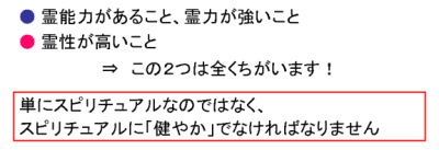 ● 私たちの本来の姿はサトヴィックな状態 サットヴァ(善性)が優位な状態を表現したのが、本アカデミーの名称にも使われているサトヴィック(Sattvic)という言葉です。サトヴィックな状態とは、言い換えると霊性が高い状態、スピリチュアルに健やかな状態です。 サトヴィックな状態でいると、私たちは自然に健康と幸せが手に入り、無理なく人生が成功に導かれるようにできています。 ここで注意して欲しいのですが、スピリチュアルであることは霊能力や超能力があるということではありません。「霊能力があること、霊力が強いこと」と「霊性が高いこと」とは、似て非なるものです。